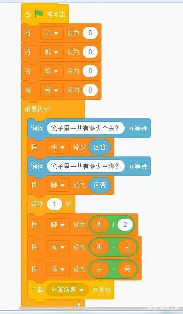 (2)变量赋值:输入总头数与总脚数,赋值给变量头与脚;
