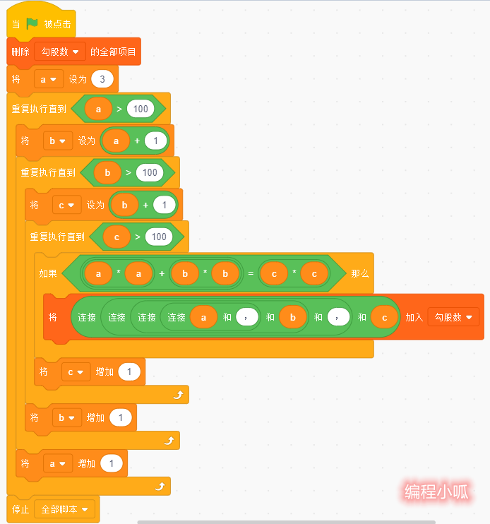 今天,我们不妨用Scratch来解一下这个古老的数学题,写出100以内所有的勾股数。