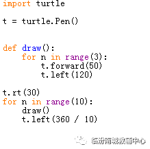 码丁实验室,一站式儿童编程学习产品,寻地方代理合作共赢,微信联系:leon121393608。 在谢声涛老师的三言学堂微信群,大家就下图进行了编程绘图等级考试40关的热烈讨论,我们用北京比邻科创张海斌老师的Python源码和云峰老师的Scratch源码来学习这40个图吧。 第19个图如下图,由4个空心十字组成。 它的代码如下图,使用了2个函数来绘制空心十字。 图形化程序如下图,图5是之前绘制的空心十字。 第20个图如下图,由5个正方形旋转组成。 它的代码如下图。 图形化程序如下图,图1是之前绘制的正方形。 第21个图如下图,由4个相同图形组成。 它的代码如下图,bk是后退的意思。 图形化程序如下图,图4是之前绘制的图案。 第22个图如下图,8个正六边形组成的图案。 它的代码如下图。 图形化程序如下图,图11是之前绘制的正六边形。 第23个图如下图,10个正三角形组成的图案。 它的代码如下图。 图形化程序如下图,图9是之前绘制的正三角形。 第24个图如下图,6个正三角形组成的图案。 它的代码如下图,goto是回到舞台中心的默认起始位置。 图形化程序如下图,图9是之前绘制的正三角形。 从以上代码和图形化绘图我们可以看出,思路一样的情况下,绘制方式会影响绘制的复杂程度。 转自公众号: 临汾南城教辅中心