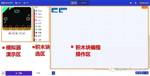 打开后Micro:bit的编程界面如下;主要分成三大功能区,剩下的就是一些保存项目,下载等,自己摸索一下即可快速上手;