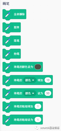 在Scratch中,有一组积木块是画笔。因为使用率的原因,3.0版本放在了扩展中,具体积木如下图。