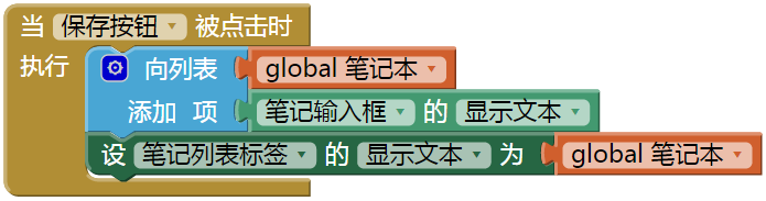 图19-13 用户点击保存按钮时,向笔记本列表中添加一条新笔记在内置块的列表抽屉中,可以找到添加列表项块。但要特别注意:还有另一个“将列表追加到列表”块,它的功能是向一个列表的末尾追加另一个列表,这个块极少使用。