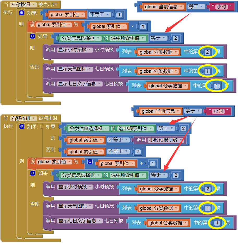 图5- 16 左右移动按钮的点击事件处理程序在上述代码中,我们利用屏幕的标题属性来显示当前的索引值,以便于对程序的测试。为了测试上述代码,我们需要在Web客户端组件的收到文本事件中,调用显示天气图标过程,来显示第一天的图标,然后再点击左右移动按钮,来查看后面几天的图标信息,代码如图5- 17所示,测试结果如图5- 18所示。