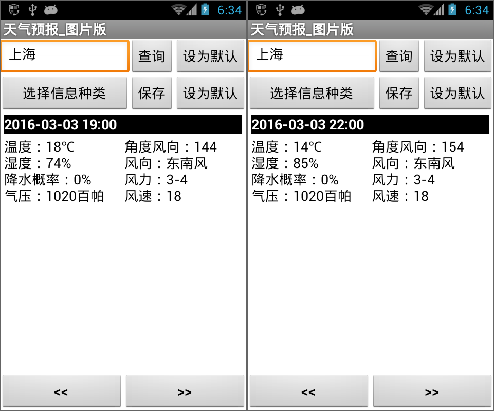 如图5- 49所示,小时天气预报信息的数据结构相对简单,不包含天气代码信息,也就不需要显示图像,仅显示时间、温湿度及风势信息。与七日预报相同的是,小时预报中包含多项结构相同的数据,不同的是,七日预报中包含7项结构相同的数据,7这个数字是固定的,而小时预报中这个数字是变动的,最小可能是1,最大是8,因此在程序的编写上要格外小心,与此相关的代码主要体现在左右移动按钮的点击事件处理程序中。