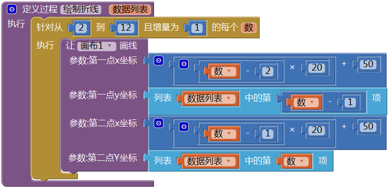 图13-20 过程——绘制折线利用上述过程,创建“绘制折线图”过程,实现完整地绘图功能,包括清除画布、绘制坐标轴、写标注文字、绘制图例以及绘制两条折线,代码如图13- 21所示;然后在绘图按钮的点击事件中调用该过程。代码的测试结果如图13- 22所示。