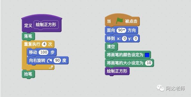 针对上面的问题,由于正方形的边长是数字,我们添加一个数字参数进来,然后继续添加文本,自定义的模块的名称变为:绘制边长为“length”的正方形,这个引号里的“length”就是我们添加的数字参数,保证之后会发现我们可以在这个新建的自定义模块里输入指定的数值,就像移动10步的代码块里的“10”这个数字,我们可以通过改变这个数字的大小来指定移动的距离,同样的,我们也可以指定“绘制边长为……”这个自定义模块里的数字来指定绘制出正方形边长的大小,代码实现如下: