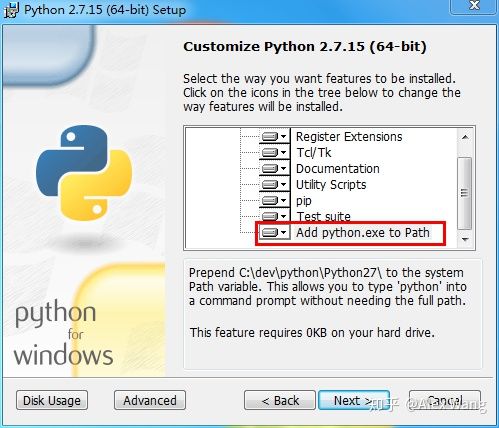 记得安装时一定要设置Add python.exe to Path属性,如下图所示: