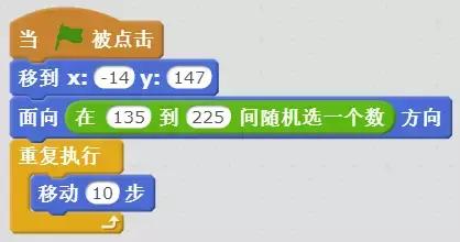 既然小球的初始位置为舞台的上边缘中部,则初始运动方向可以向下以一定角度运动,则角度值范围为135度到225度之间,为了增加游戏的不确定性,使用随机数模块。