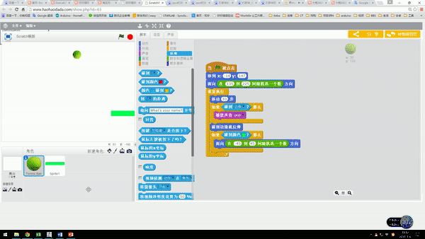 Scratch角色库中的角色一般都自带音效,本例中的小球自带名为“POP”的音效。