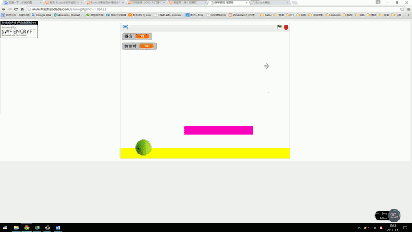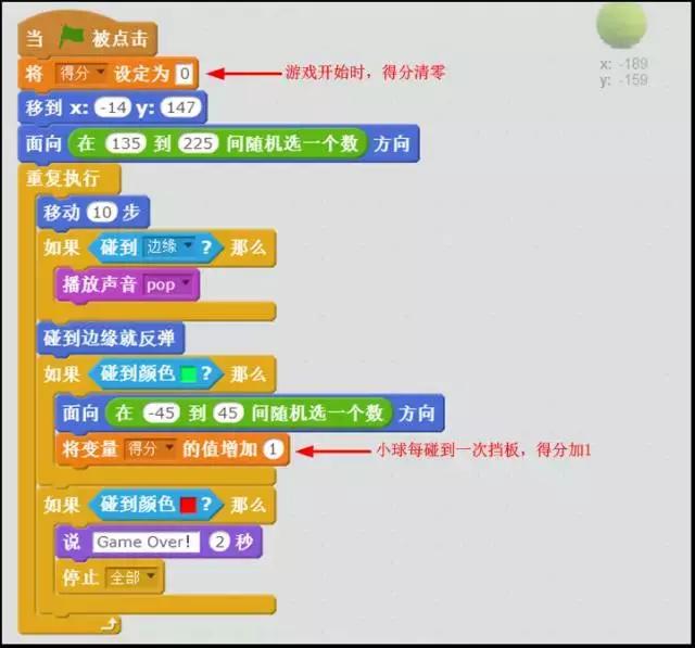 之前的脚本,小球的运动速度为恒定的“10步”,我们可以将小球的运动速度设定为“10+得分”,这样,当你得分越高,速度就越快。