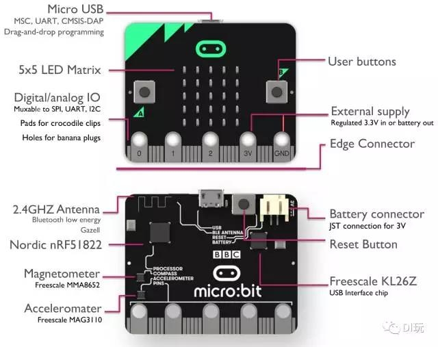 “集成5×5 LED显示屏,两颗可编程按键,加速度计,电子罗盘,温度计,蓝牙等模块。其IO扩展口可通过鳄鱼夹引出,使用扩展插槽后能连接多达20个外部模块,支持读取传感器数据,控制舵机与RGB灯带等。”以上是DFRobot对这款产品的硬件规格的介绍,一块邮票大小的板子,集成度上秒杀了Arduino UNO甚至Arduino101,价格只要人民币128,不是1288,不是688,是128,八星八箭….(看懂梗的暴露年龄了)