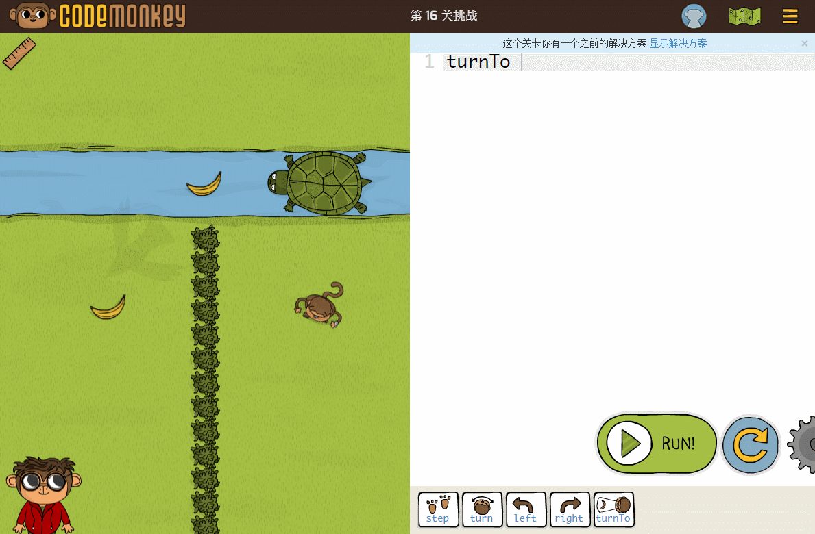 每个关卡一开始,孩子会看到左边的动画窗口里有猴博士、小猴子、香蕉和道具,右边的代码窗口里有代码、”RUN!”按钮、代码的图形化表示。即使孩子不会写单词,点击代码的图形化按钮,代码窗口会自动写出代码。