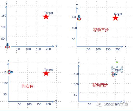 所谓相对,即相对于角色当前的状态而言,如图3所示,和之前不同的是图中没有任何可以参考的坐标,那么火箭要如何才能击中目标呢?如果火箭Rocket会说话,它一定会说:“向前移动三步,向右转,再向前移动4步”。