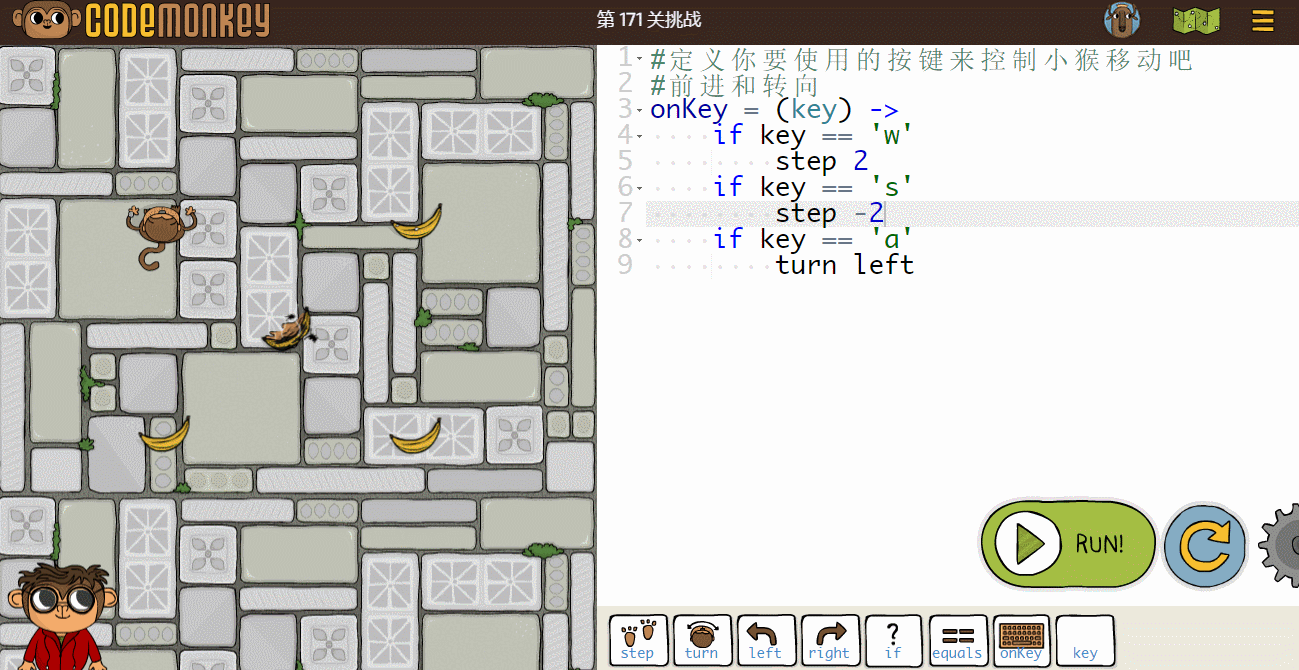 点击RUN!之后,不管我们按键盘上的什么按钮,小猴子就向前走。按一下键盘上的键,小猴子就走一步。
