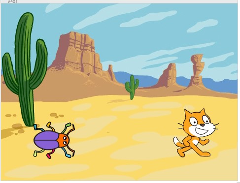 这次学习的主角还是这只爱溜达的小黄猫,它在沙漠里跑来跑去,这次遇到了虫子。让我们开始吧。 首先将舞台背景换为沙漠,将两个游戏角色——小黄猫和甲壳虫加入到舞台上来。
