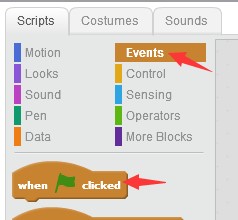 选择Event 中的点击小绿旗代码块,将其拖入右侧代码编辑区域,表示点击舞台右上侧小绿旗时候启动之后的程序。