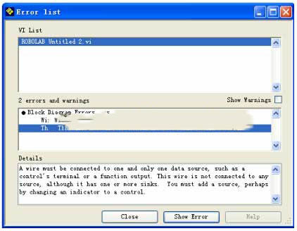 当“运行”按钮显示成一个断开的箭头,这意味着程序没有完成或有错误。单击这个按钮,将出现一个列出你的程序上的错误的清单。在错误列表中单击,然后单击“ShowError”按钮,程序中有问题的区域或图表将加亮显示。