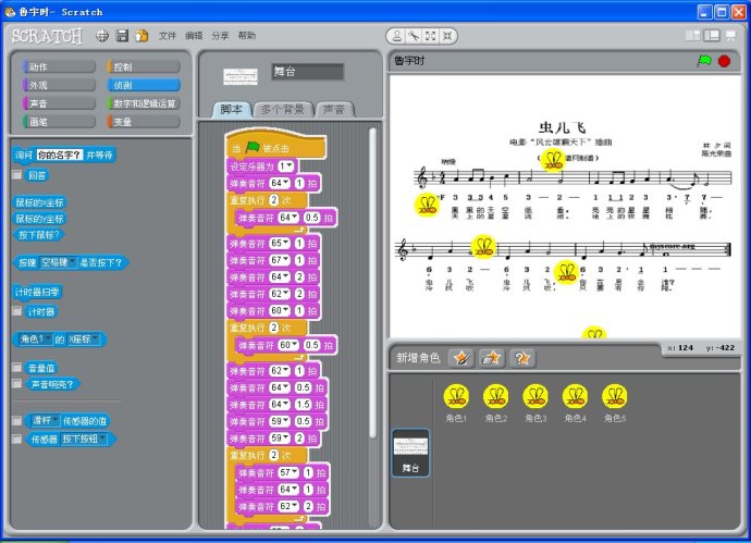 2、小结:今天同学发现了SCRATCH有神奇的音乐功能,发挥想象,在我们创作作品的过程中,如果想自己来一段配乐,就可以自己来设计了。