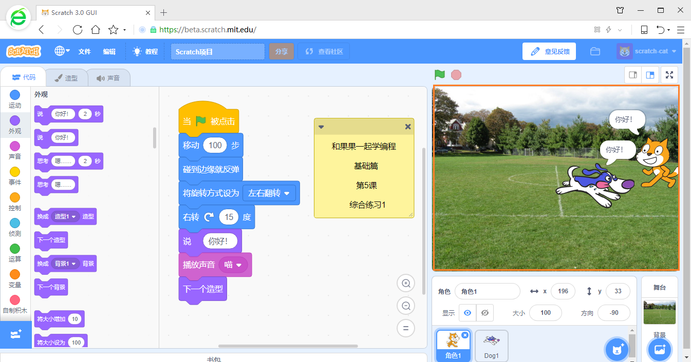(4)用鼠标点击屏幕左下角,带小猫头像的蓝色圈,选择一个角色,增加一个小狗的角色。选择左边竖排第2个,深蓝色圆圈“外观”,拖放“说你好”积木到工作区。选择左边竖排第3个,紫色圆圈“声音”,拖放 “播放声音dog1”积木到工作区。