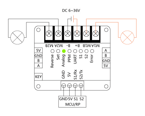- PPM(两路脉宽信号输入):信号源可由模型遥控接收机直接产生,或自行使用单片机产生。