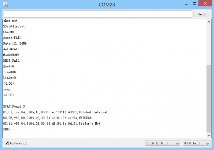 set wlan ssid your router’s SSID (例:“set wlan ssid DFRobot&Wifi” )注意:原来的网络SSID为 DFRobot Wifi,因模块不识别空格,故用$代替空格。