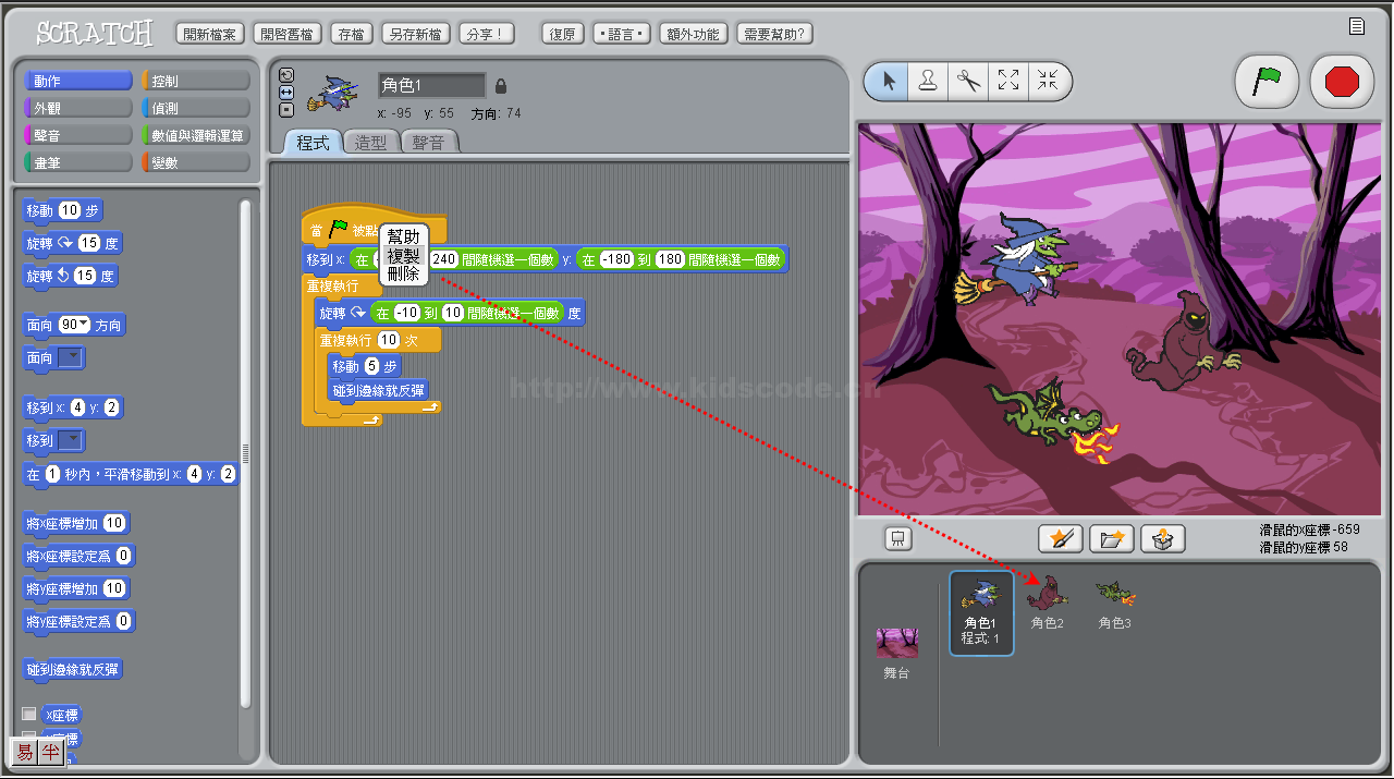 在程序码上按鼠标右键,选取复制后拖曳至另一个角色,就会将程序码套用到该角色上