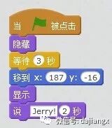 使用隐藏指令让猫隐藏起来,等待3秒中时间,将猫移动到一个指定的坐标位置,然后在显示出来,并大喊“Jerry!”。