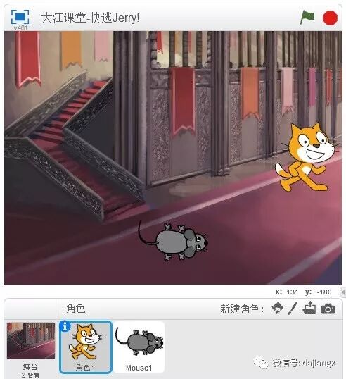 角色的移动、隐藏和显示,在前面的课程中都有介绍,详细小朋友们都已经掌握,已经不是难点。这个项目关键处就是要思考清楚Jerry如何沿着楼梯线路逃跑。