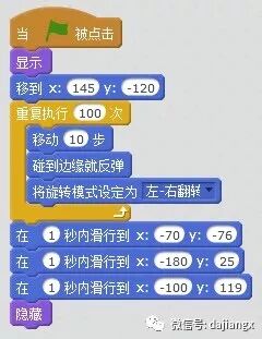 当老鼠来回走过几次后,使用滑行指令让老鼠Jerry移动到第一个坐标点(-70, -76),然后添加后面两个坐标点的位置,最后将老鼠隐藏起来。如下图所示。