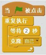 当动画或游戏中需要出现多个相同的角色时,为了减少重复的工作量,无需新建多个相同的角色,Scratch为这类应用提供了“克隆”积木: