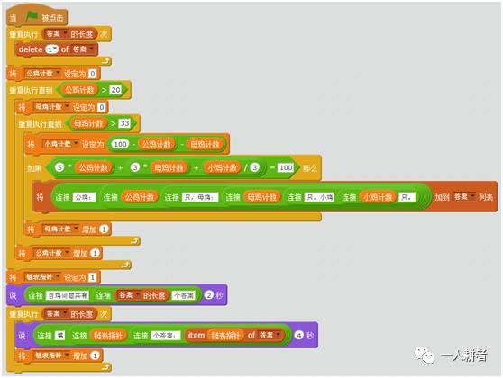 这段代码通过三组循环来遍历所有答案,首先最外层,假设公鸡=0,其次第二层,假设母鸡=0,最后在第三层内控制小鸡的数量,小鸡计数从0到100循环101次,然后比较两个条件,一个是公鸡+母鸡+小鸡是否等于100,一个是公鸡母鸡小鸡的花费是否等于100,如果两个条件都满足,则说明这组数字是符合题目要求的,因此把这组数字保存在答案链表当中。