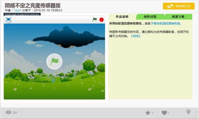 与普通 Scratch 程序作品一样,传感器板程序作品也是由作品名称、作者信息、作品预览以及作品说明等内容组成。但与普通 Scratch 不一同的是,直接单击“开始旗”,程序不会正常运行,这是由于这些程序作品都是基于“好好搭搭传感器板”开发的,在使用之前必须连接传感器板。