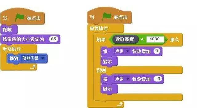 第二段代码用于设置智能飞屋角色的亮度值。周围环境变暗时则智能飞屋的亮度值也降低,反之,则亮度值增加。可以根据