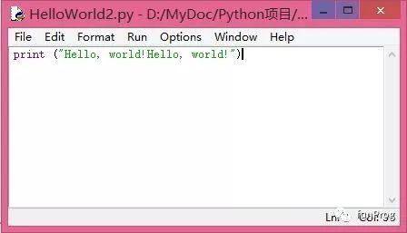 首先从Python Shell的文件菜单中,打开我们之前写好的HelloWorld.py文件,并将引号中的Hello, world!复制一遍,然后粘贴(如下图)。将文件另存为HelloWorld2.py。