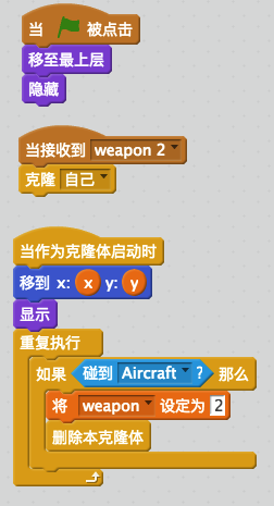 我们可以看到这角色里有一个反复出现的词,missile,这就是aircraft的子弹,如果碰到敌机或障碍物,它就会和它们一起消失,先创建一个变量:weapoon,再来编写这个角色的代码吧!
