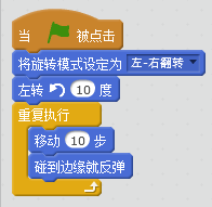 而下面这三个程序是炮弹剩下的程序。可以看到他们都是以“作为克隆体启动时”开始的,这就和上面程序里的“克隆自己”衔接起来了。上中下三个程序的作用分别是:炮弹向上移动;炮弹碰到边缘消失;炮弹打中蝙蝠后记一分和消失。