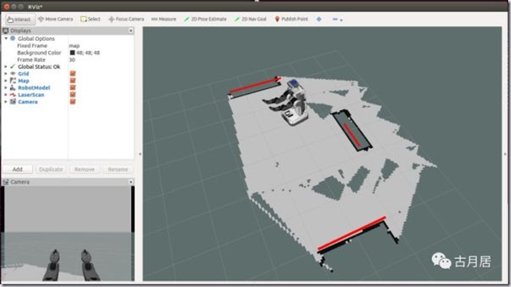 启动成功后,gmapping节点就开始SLAM建图了。启动rviz并添加显示插件后,可以看到如图所示的SLAM效果。