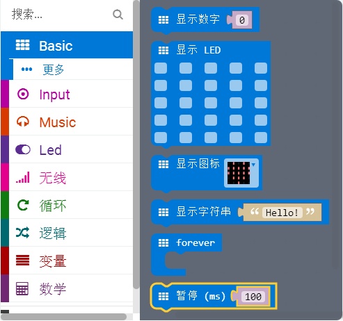 02 继续拖入“暂停(ms)”积木,使用默认的100毫秒(ms)参数设置:
