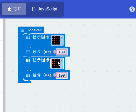 01 在forever(无限循环)积木框中,拖入“显示图标”积木: