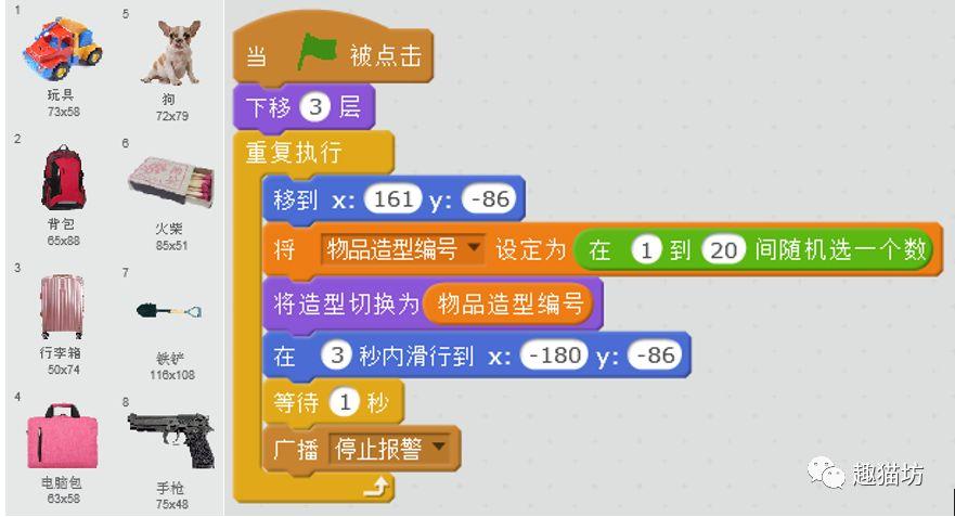物品进入安检机的机箱内会被遮挡,直到从安检机内部出来才能看见。怎么实现这个功能呢?很简单,将“安检机”角色置为顶层,“物品”角色下移几个图层就可以了(scratch控制图层的能力感觉有点不好用,尤其是有多个角色要设置不同图层时,具体下移几层可以通过测试来决定)。