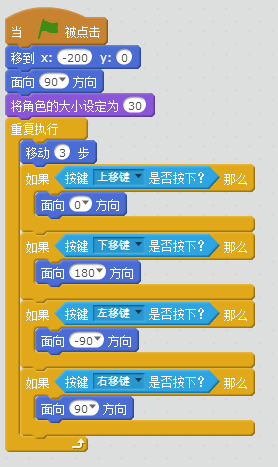 1.蛇头的脚本比较简单,只用一直移动,并随着按键键改变方向即可。这里我们没有使用“当按下xx键”,而是使用了重复执行,然后检测按键按下,这样做的好处就是反应比较灵敏,操作感比较强。如下图: