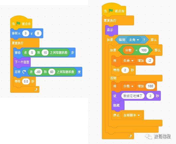 这段代码中,生命值-1后等待2秒非常重要,如果没有这个等待,我们会发现,主角吃掉小鱼1没有啥问题,但是当主角分数不够10分而碰到小鱼2时,生命值会瞬间下降非常多,甚至很快出现负数,这是什么原因呢?查看我们代码的最后一段,这段的逻辑是,一旦主角碰到小鱼2的克隆体,如果分数不足10分,则生命值将会下降,但是此时小鱼2并没有被吃掉,还是存在的,因此他会持续的碰到主角,分数也就会持续的下降。