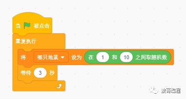 我们先设置一个变量“哪只地鼠”,然后在舞台里编程,每隔2秒钟,对“哪只地鼠”产生一个1-9的随机数。然后我们就可以根据这个变量的随机数值去让哪只地鼠出来。在复制其他地鼠的时候记得改坐标。