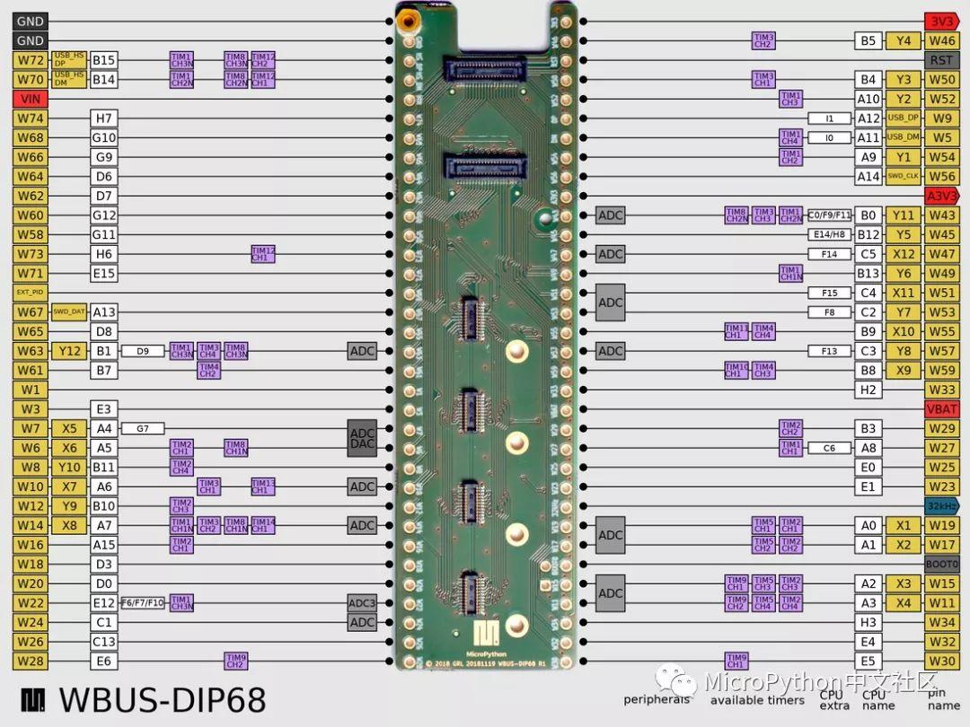 全新的pyb D 系列开发板是基于 STM32F7 高性能处理器的pyboard开发板,除了兼容旧版本 pyboard 的功能外,还新增加了 2个 QSPI 闪存、蓝牙/wifi、WBUS扩展接口等功能。