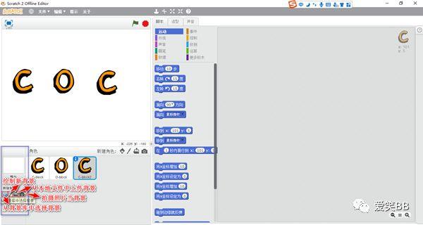 为舞台更换背景:在“角色”面板旁,选择“新建背景”的方式。