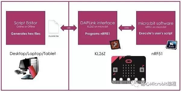 一般程序写好后透过USB 转到micro:bit , 整个流程由两个芯片完成,一是 KL26Z负责程序刷新(code flashing) ,另一nRF51822则执行完成用户完成的程序。
