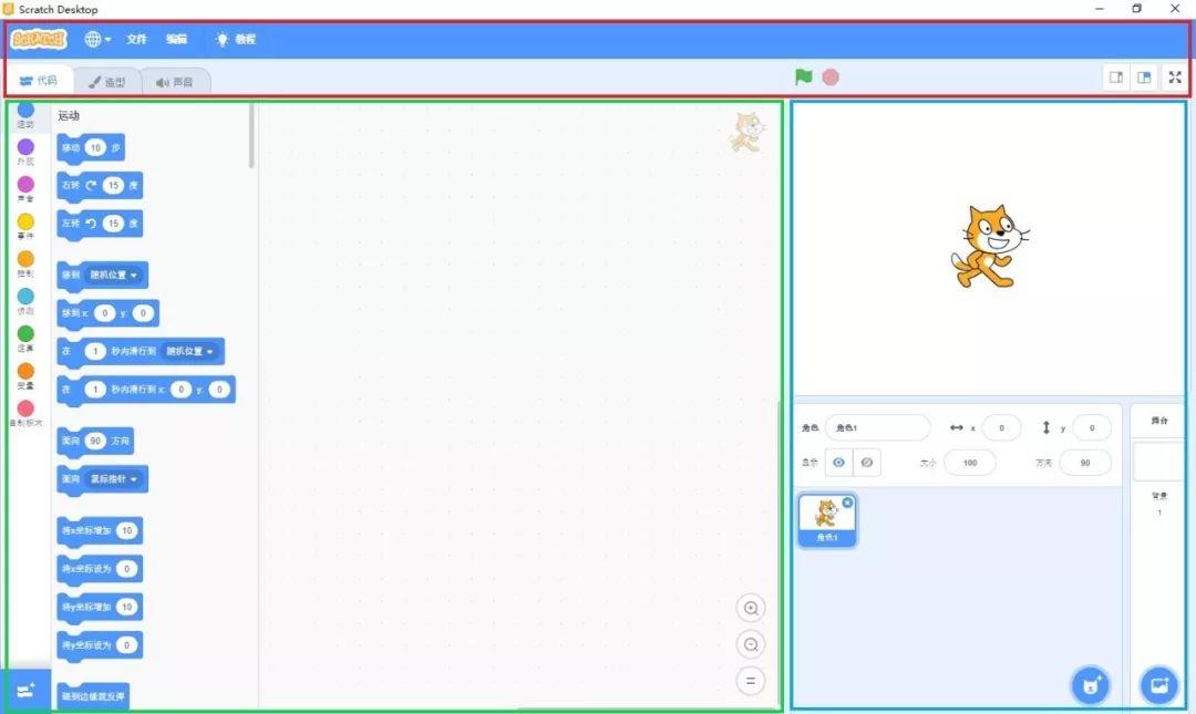代码区从左到右分布的三块空间,最左边最窄的部分叫做功能区,它使用了若干种不同的颜色来区分其功能;中间的部分叫做积木区,我们编写Scratch程序时用到的就是各种功能的积木,如果在功能区选择不同的功能,就可以改变积木区中的积木,我们会发现每个积木区的积木块颜色都跟功能区的颜色保持一致,这也是我们以后编写程序时使用颜色就可以对功能做出判断的关键;最右边的这片很大的区域,是代码编辑区,我们的代码就要在这片区域中进行编写。