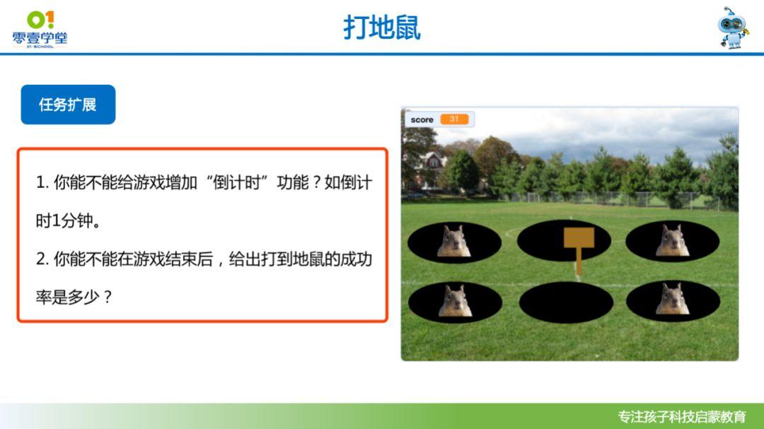 这节课,我教你通过编程做了一个小游戏:打地鼠。通过完成这个任务,教你熟练使用变量、广播;熟练绘制角色造型;熟练使用侦测、控制、外观、运算等程序指令。