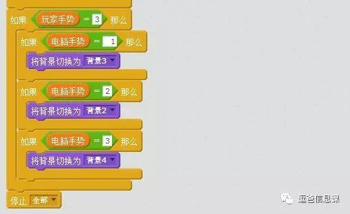 解决思路:设置两个角色和两个变量,分别为“玩家手势”和“电脑手势”,玩家手势变量通过按键控制赋值,这个值就是造型编号!电脑手势则随机赋值,值也是造型编号,两个角色的造型编号是一致的。通过两个变量的比较,如果玩家手势值为1即布,电脑手势值为1即布,则背景切换为once more;如果玩家手势值为1即布,电脑手势值为2即剪刀,则背景切换为lose;如果玩家手势值为1即布,电脑手势值为3即石头,则背景切换为WIN,以此类推!