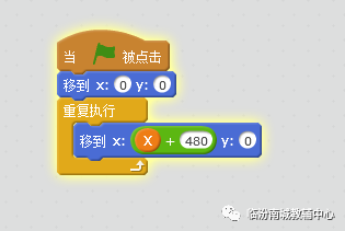 原来这8个角色分别处在小孔角色的左上、上、右上、右、右下、下、左下和左这8个位置,并且与小孔角色相连且跟随鼠标同步运动,这样不管小孔角色怎么移动,因为其它角色也跟随移动,所以舞台始终是红色。上图是最右侧角色的程序。